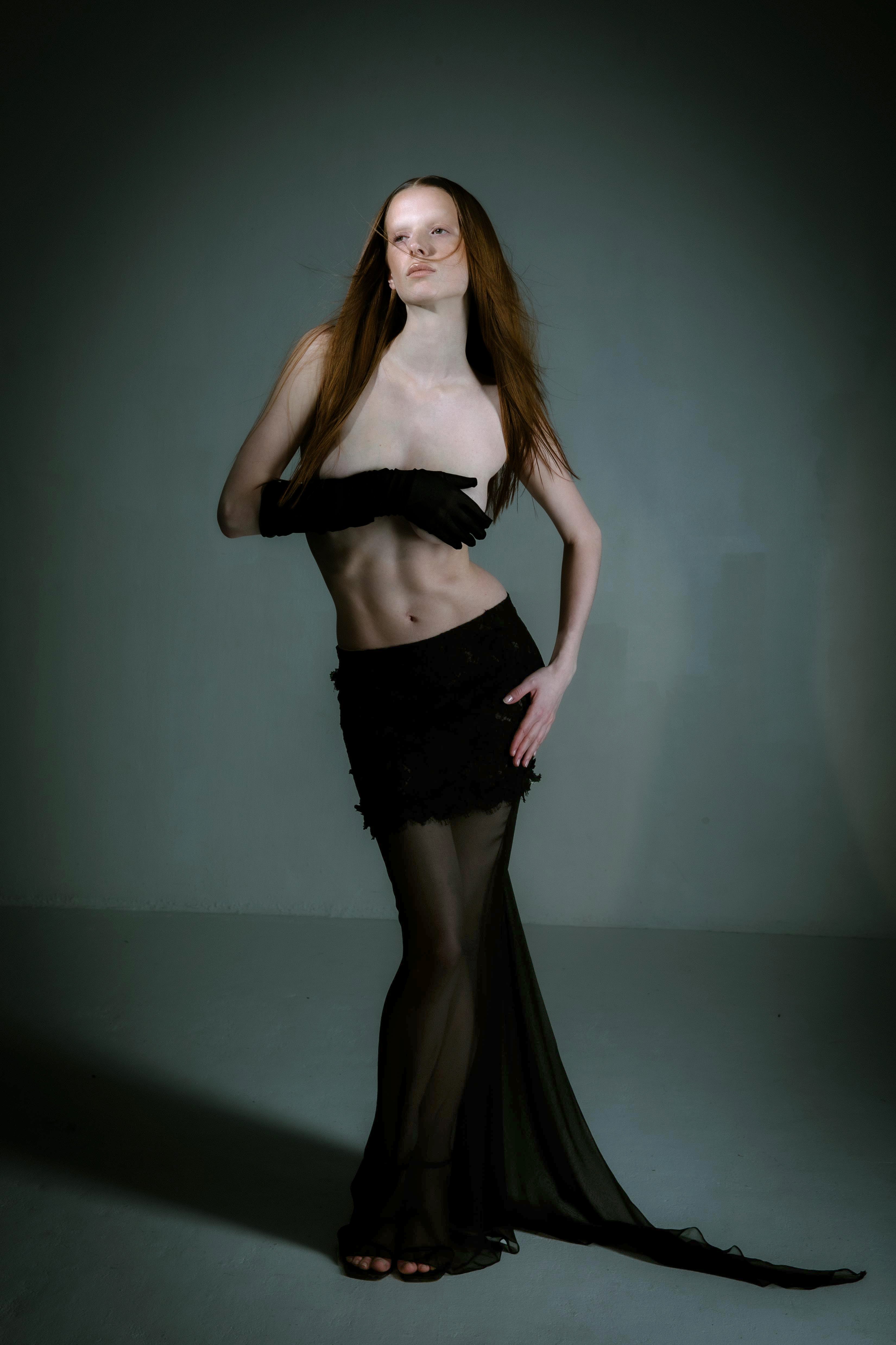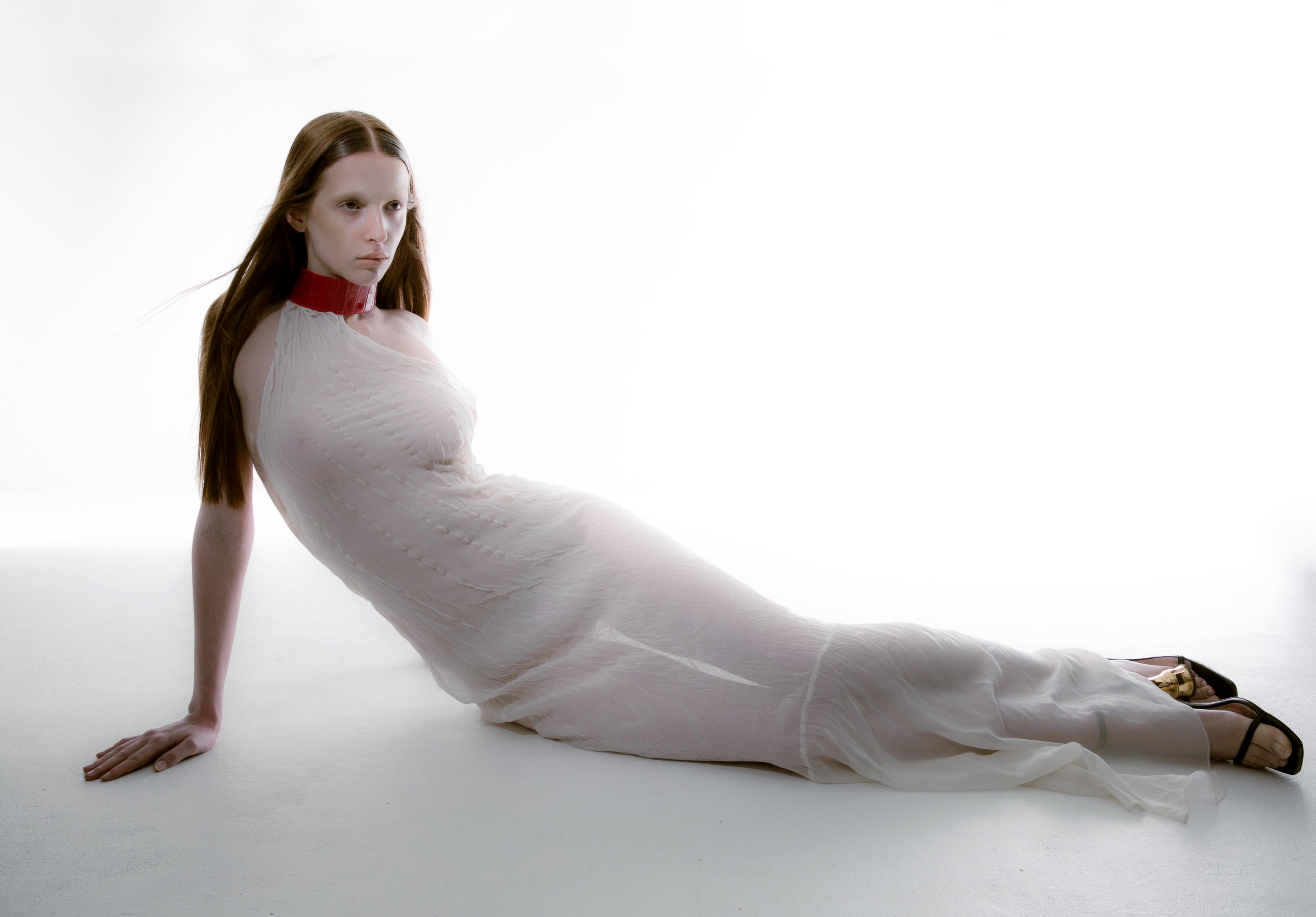 Her story resonates in this first approach, at once elegant and violent. Just as clothes are a vehicle for self-expression, in this collection they mirror the story of a woman held in her inner violence, chained to her anger, wanting to break her those. This silence invokes a mystery and coldness to this enigmatic character and arouses curiosity. It also concedes a deifying history and an aura both dark and luminous to this icon.